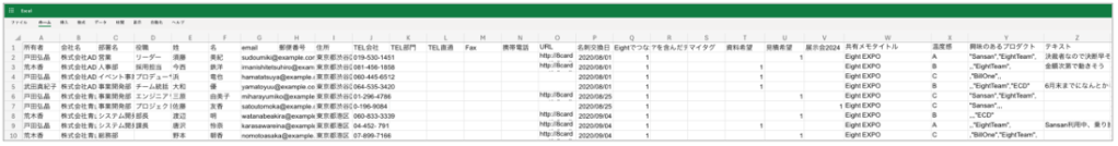 所有者、会社名、部署名、役職、氏名(姓/名)、e-mail、郵便番号、住所、TEL(会社、部門、直通)、FAX、携帯番号、URL、名刺交換日、Eightでつながっている人、’?’を含んだデータ、マイタグ(カンマ区切り)、社内共有タグ、共有メモ(テンプレートタイトル、項目名、選択肢、テキストメモ)