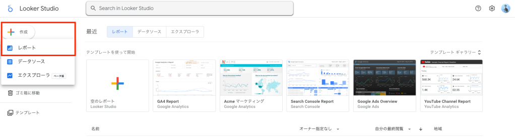 続いてLooker Studioを開き、左上の[作成]から[レポート]を選択しましょう。